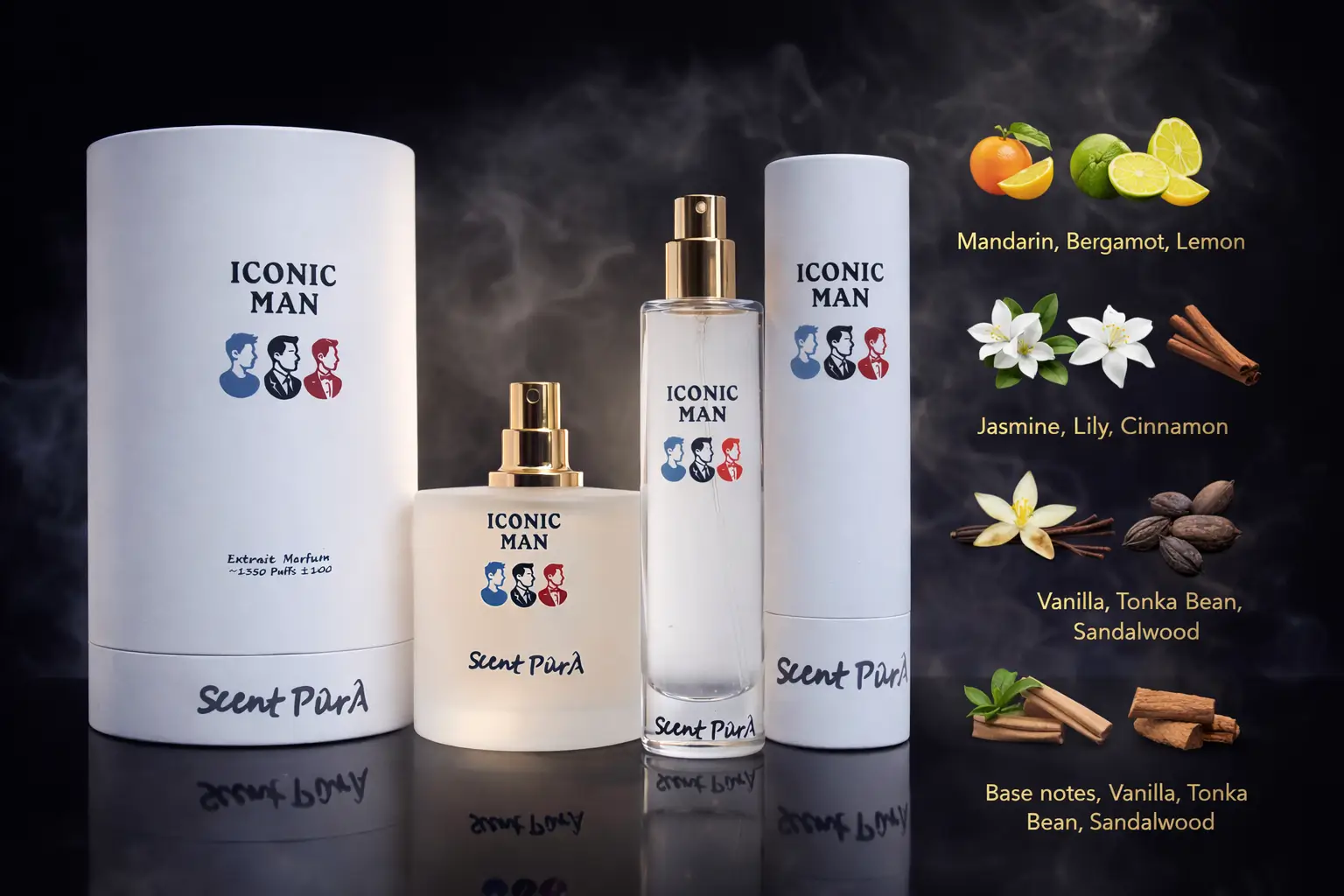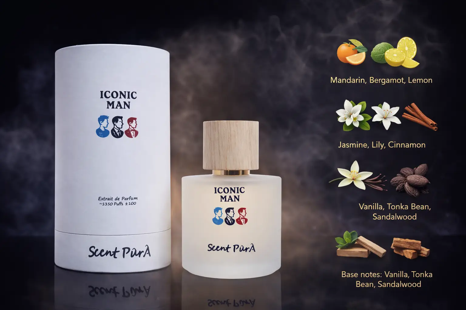 Iconic Man is a modern men’s fragrance featuring fresh citrus notes, a warm spicy heart, and a smooth woody base. With mandarin, bergamot, jasmine, cinnamon, vanilla, tonka bean, and sandalwood, it delivers confidence and long-lasting elegance.