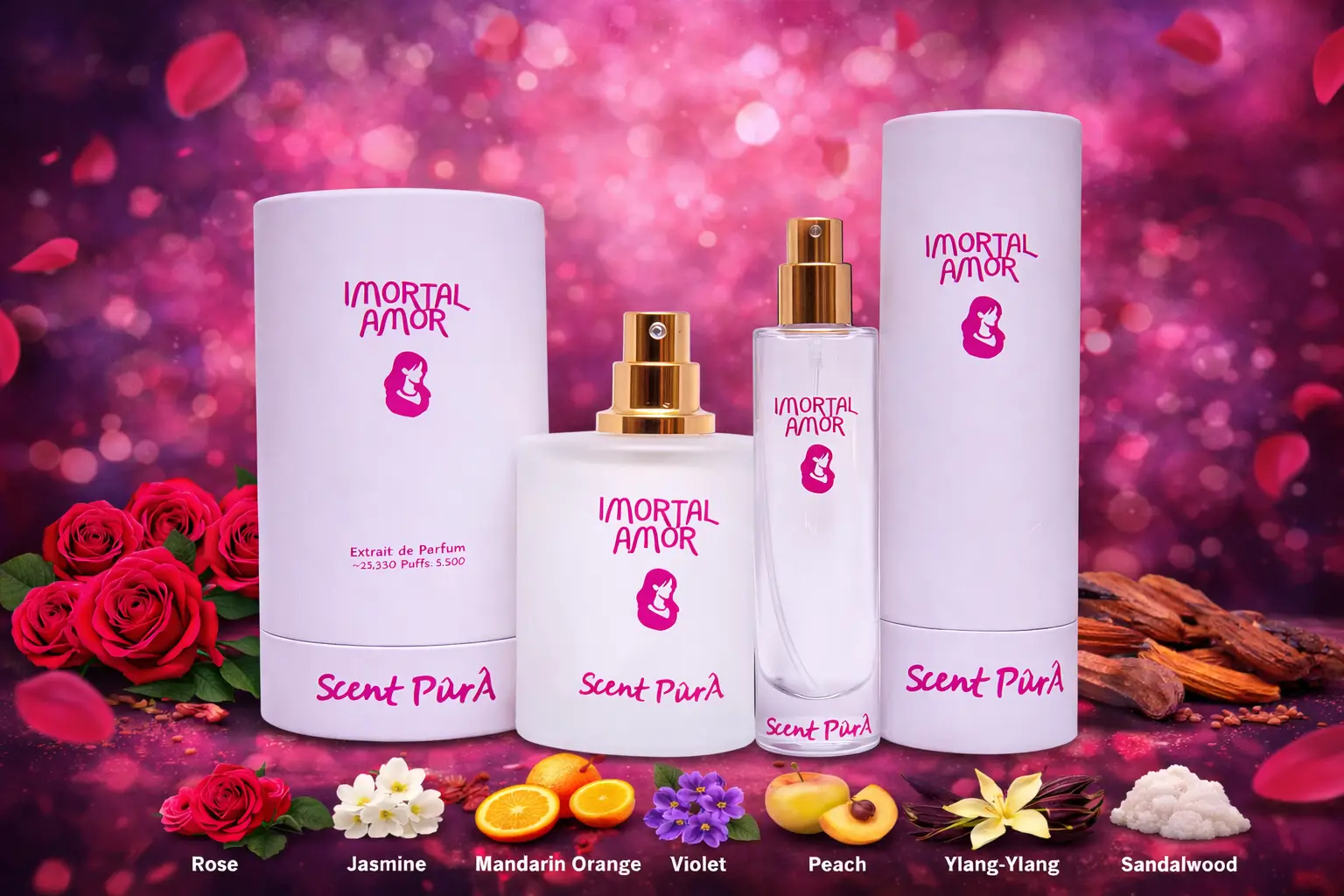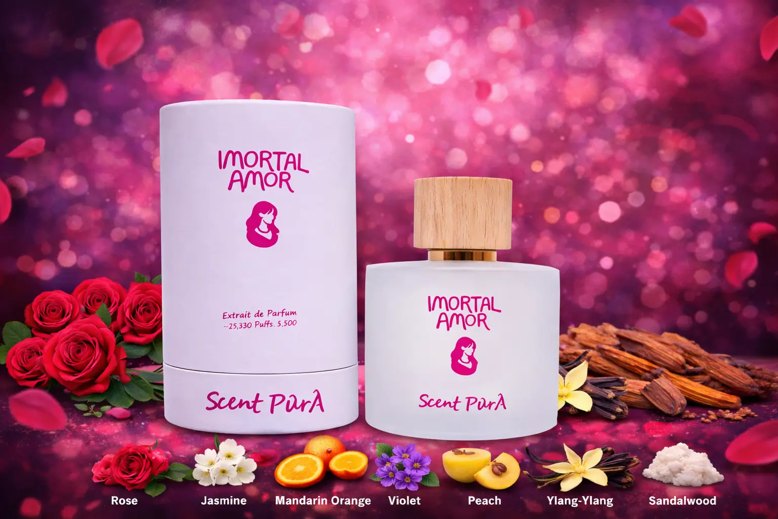 Imortal Amor is a romantic fragrance featuring rose, jasmine, mandarin orange, violet, peach, ylang-ylang, vanilla, musk, and sandalwood. Soft, elegant, and long-lasting.