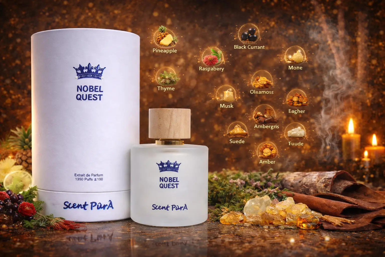 The heart of Nobel Quest reveals smoky depth and refined texture. Birch introduces a bold smoky edge. Patchouli adds earthy warmth and structure. Jasmine brings soft floral smoothness. Together, these notes feel confident and composed. Raspberry adds gentle sweetness with elegance. Saffron and thyme introduce subtle spice and warmth. This stage feels rich and luxurious.