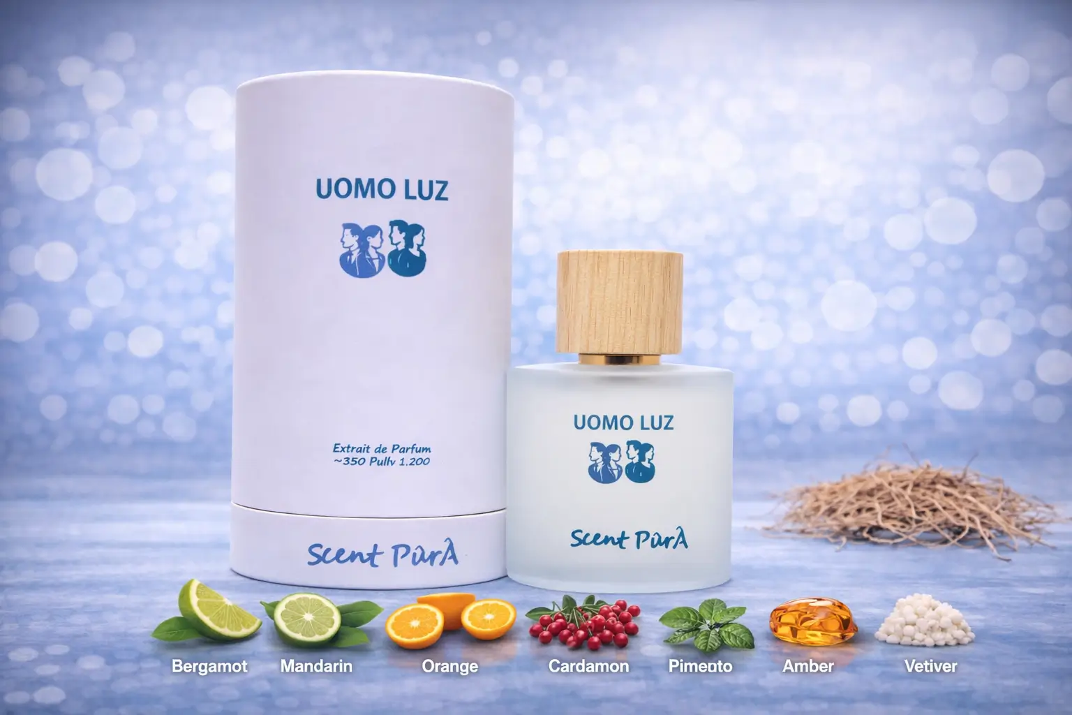 Uomo Luz is a sophisticated men’s fragrance featuring ambroxan, bergamot, orris root, ambergris, jasmine, woody notes, musk, patchouli, and cashalox. Elegant, refined, and long-lasting.